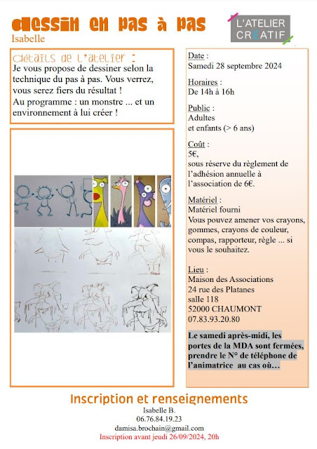 5 adultes, 1 ado et 3 enfants, voilà un bel atelier intergénérationnel ! Chacun démarre très concentré, par le dessin technique en pas à pas, avec un peu d'appréhension, en se demandant quel sera le résultat ! Et les voilà ! Ne sont-ils pas craquants ces horribles monstres dégoulinants ! Ensuite, chacun, librement, insère dans son dessin une souris aux gros yeux, un bonhomme stylisé, des éléments de décor ... Les réalisations des autres donnent des idées ! Chacun peut être fiers de son dessin ! Merci à tous pour votre participant, votre bonne humeur et votre satisfaction !